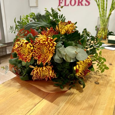 Fet principalment per l'insòlit crisantem Uniflora Fire (vermell i groc), i Eucaliptus plata.